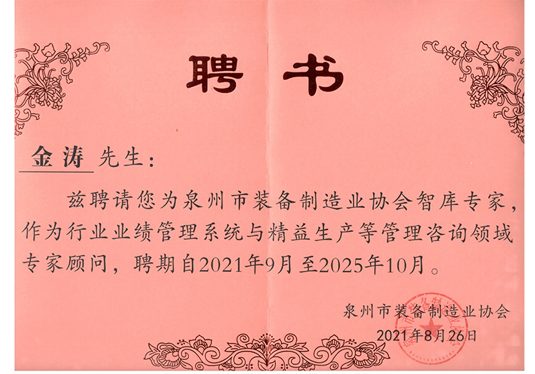 金涛教授被聘为泉州市装备制造业协会智库专家