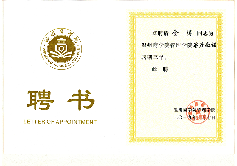 金涛教授被聘为温州商学院管理客座教授